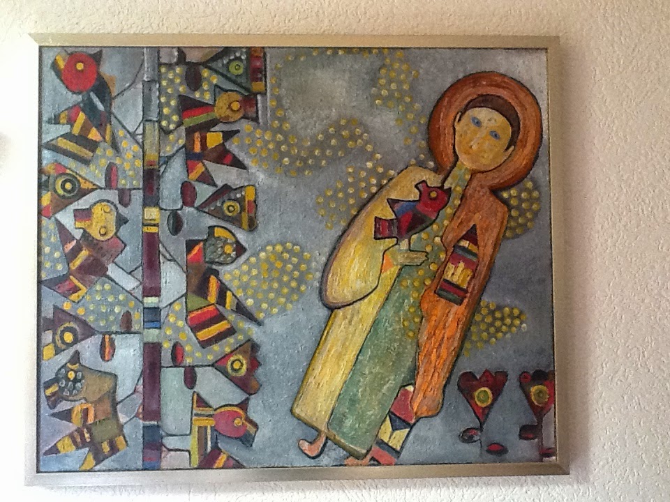 Bij Wil thuis hangt boven de eettafel een prachtige moderne afbeelding van Franciscus van Assisi. Gisteren ben ik mijn fototoestel vergeten, dus moet ik daarvan een andere keer een opname maken.